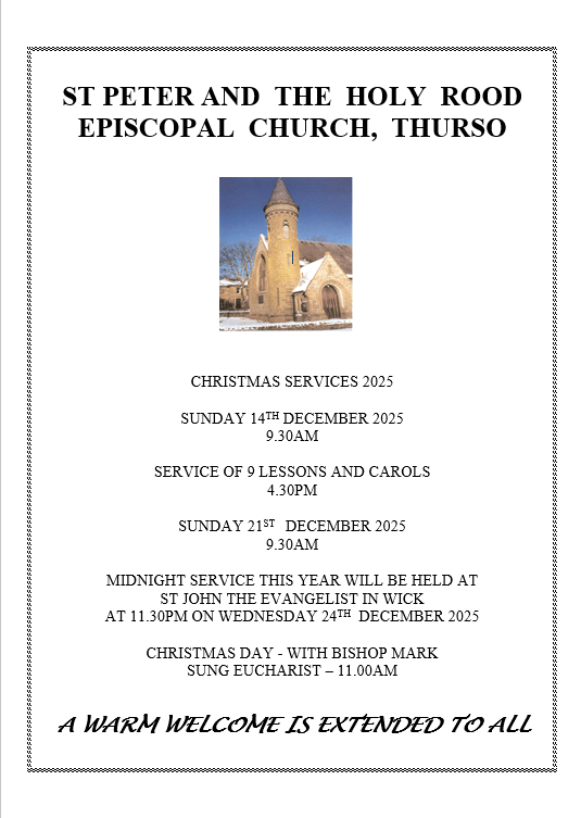 The ministry of the two churches in the linked charge of St Peter & the Holy Rood and St John the Evangelist, includes Eucharistic Ministers, Lay Readers, a Lay Preacher, a Deacon, and the Priest in Charge. Between us, we offer a variety of services each week. The Sunday services from Thurso will be available in the church building , the midweek services are available on Zoom (please contact us through the website if interested), Evening Office is on Zoom and Facebook.